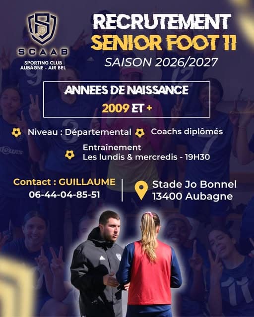 Le SC Aubagne – Air Bel lance son recrutement pour son équipe Sénior Féminine (foot à 11 – niveau départemental).